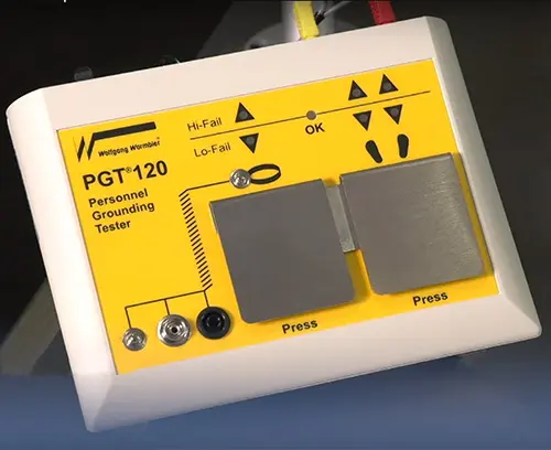 Das PGT 2000 ist ein Prüfgerät für Personenerdungssysteme mit Benutzeridentifikation und Messwertdokumentation. Die Benutzeridentifikation erfolgt über einen ID-Baustein am rechten Schuh und/oder Transponderkarte.