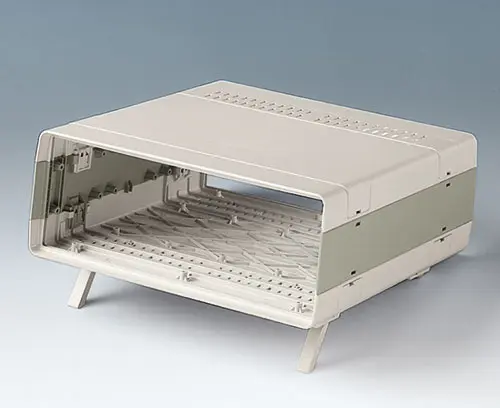 EUROPA-GEHÄUSE 42 TE, o. Griffb. Baukasten-System ohne Verschraubung. Befestigungstürme in den Gehäuseschalen und Seitenteilen.