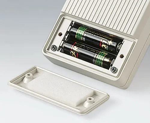 UNI-MESS-BOX N, Ausf. I Großes komfortables Handgehäuse. Mit vertiefter Fläche, z. B. für Folientastaturen, Bedienelemente. Von außen zugängliches Batteriefach mit rastendem Batteriefachdeckel. Für 2 x 9 V Flachbatterie (PP3) oder 4 x 1,5 V Mignonzellen (AA). Sichtöffnung für Digital- oder Analoganzeigen. Hochgezogene Freifläche für Steckermontage an der Stirnseite des Unterteils.