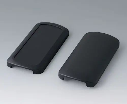 Grundgehäuse, 2-teilig, mit konvexer und abgeflachter Gehäuseschale. Vertieft liegende Fläche zum Schutz der Folientastatur, Dekorfolie oder eines Etiketts. Beide Stirnseiten offen. Darin können wahlweise Stirnteile oder die Kabeltüllen-Sets eingebracht werden (Zubehör). Vier Befestigungsdome für eine Platine in der abgeflachten Schale. Kunststoffgehäuse voll gerastet.