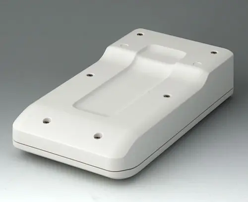 2-teiliges kompaktes Handgehäuse mit Dichtung in einem ergonomischen, robusten Design. Sicheres Halten durch eine Fingermulde im Unterteil. Vertieftes Bedienfeld zum Schutz der Bedienelemente. Befestigungsdome für Platinen und Bauteile im Ober- und Unterteil.