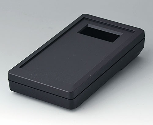 Kleines Handgehäuse in anspruchvollem Design. Mit von außen zugängliches Batteriefach für 2 x 1,5 V Mignon-Zellen (AA) oder 1 x 9 V Flachbatterie (PP3). Vertieftes Bedienfeld zum Schutz der Eingabeelemente. Dichtung für IP 65 als Zubehör.