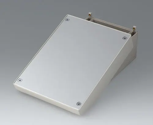 DATEC-TERMINAL M, Ausf. I Grundgehäuse mit Klemmenraum. Ergonomisch günstig geneigte Bedienfläche für wahlweisen Einsatz einer Frontplatte, Profilplatte oder Haube. Geeignet für den Einbau von Europa-Karten 100 x 160 mm.