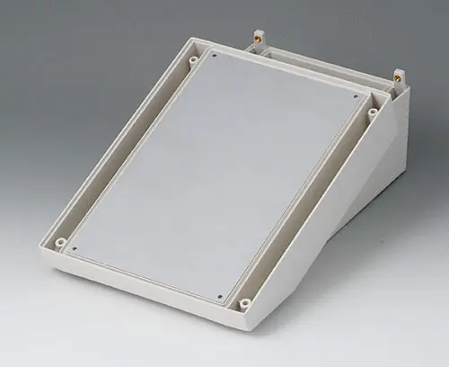 DATEC-TERMINAL M, Ausf. I Grundgehäuse mit Klemmenraum. Ergonomisch günstig geneigte Bedienfläche für wahlweisen Einsatz einer Frontplatte, Profilplatte oder Haube. Geeignet für den Einbau von Europa-Karten 100 x 160 mm.