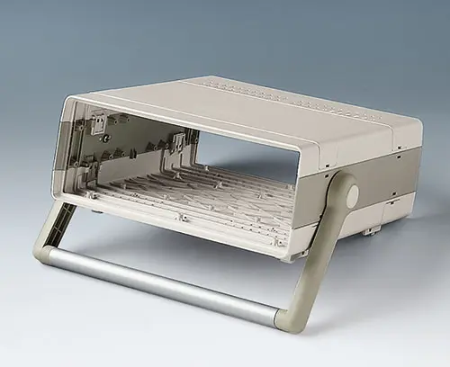 Griffbügel zum Tragen und Schrägstellen des Gerätes. Mit belastbarem Einrastmechanismus in 30°-Stufen verstellbar. Al-Profil (AS050124 silber / AS051254 schwarz) in der erforderlichen Länge als separates Zubehörteil (auf Anfrage). Die Profillänge ist 16 mm kleiner als die Gehäusebreite.