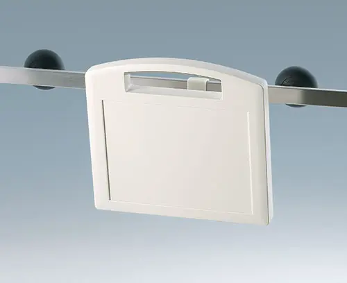 CARRYTEC L Robustes Kunststoffgehäuse mit Griff. Vertieft liegende Fläche für Folientastaturen. Plane, stoßgeschützte Flächen am Gehäuseunterteil für den Einbau der Schnittstellen, Steckverbinder, Peripheriegeräte etc. Rückseitige Schnittstellenmontage, z.B. Tragarmanwendung, ermöglicht saubere Kabelführung über Gehäuseanbindung, Befestigungsdome kompatibel zu VESA-Standard (100 x 100 mm). Befestigungsdome für Platinen und Bauteile im Ober- und Unterteil. Sockel für einfache Daten- und Ladestromübertragung sowie Batteriefach 5 x AA (Bearbeitung auf Anfrage) als Zubehör.
