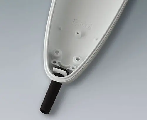 STYLE-CASE L 2-teiliges Handgehäuse in einem ergonomischen robusten Design mit angenehmer Haptik. Dicht bis IP 65 mit Dichtung (Zubehör). Schutzart IP 40 ohne Dichtung. Befestigungsdome für Platinen und Bauteile im Ober- und Unterteil.