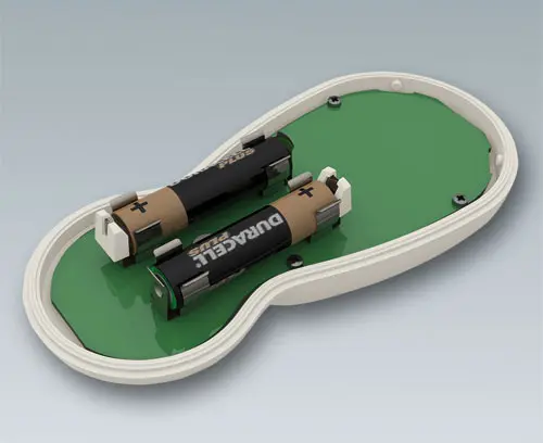 SYNERGY R100 4-teiliges Gehäuse für vielfältige Einsatzbereiche. Stabiler Rahmen aus Aluminium, glasperl-gestrahlt und eloxiert. Kunststoffteile aus ASA+PC-FR mit hohem UV-Schutz und hohem Flammschutz. Befestigungsdome für Platinen und Bauteile im Ober- und Unterteil. Oberteil mit vertieft liegender Fläche zum Schutz der Folientastatur. Unterteil mit Öffnung und Deckel zum Verschrauben: Praktisch für den Einsatz eines Batteriefachs oder als Zugang zum Innenraum, z.B. für Memory Card oder Batterien, die direkt auf der Platine befestigt sind. Batteriefach-Set 2 x AA mit Kontaktfedern, Batterie-Clips, Knopfzellenhalter und Wandbefestigung als Zubehör.