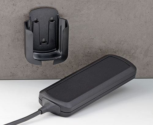 Halter M Spezieller Halter für CONNECT M  zur sicheren Verwahrung kabelgebundener und drahtloser Mobilgeräte. Mit großer Aussparung für Steckverbindungen. Die Befestigung erfolgt an der Wand oder sonstigen Bauteilen mit handelsüblichen Schrauben mit einem Kopfdurchmesser von 5,5 bis 7 mm.
