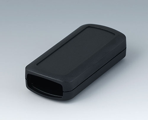 CONNECT S Grundgehäuse, 2-teilig, mit konvexer und abgeflachter Gehäuseschale. Vertieft liegende Fläche zum Schutz der Folientastatur, Dekorfolie oder eines Etiketts. Beide Stirnseiten offen. Darin können wahlweise Stirnteile oder die Kabeltüllen-Sets eingebracht werden (Zubehör). Vier Befestigungsdome für eine Platine in der abgeflachten Schale. Kunststoffgehäuse voll gerastet.