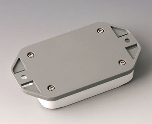 2-teiliges Kunststoffgehäuse mit flachem Oberteil. Unterteil mit integriertem Flansch zur schnellen Wandmontage oder zur Befestigung an Schienen und Rohrprofilen bzw. am Mast. Robuste Konstruktion mit bewährter Nut-/ Federverbindung. Verschraubung mit Edelstahlschrauben und Torx-Antrieb. Fixiersockel für Platinen und Bauteile in Ober- und Unterteil. Die Befestigung auf den Sockeln erfolgt mittels Heißverstemmen.