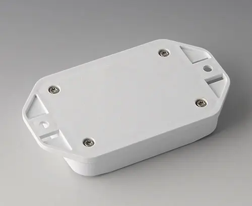 2-teiliges Kunststoffgehäuse mit flachem Oberteil. Unterteil mit integriertem Flansch zur schnellen Wandmontage oder zur Befestigung an Schienen und Rohrprofilen bzw. am Mast. Robuste Konstruktion mit bewährter Nut-/ Federverbindung. Verschraubung mit Edelstahlschrauben und Torx-Antrieb. Fixiersockel für Platinen und Bauteile in Ober- und Unterteil. Die Befestigung auf den Sockeln erfolgt mittels Heißverstemmen.