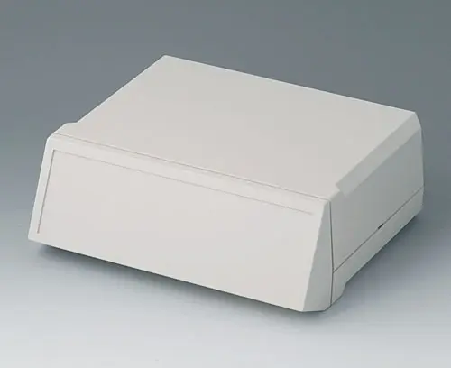 MOTEC M, flach/hoch Tisch-Gehäuse mit flachem Unter- und hohem Oberteil. Schraubenlose Montage der Gehäuseschalen. Stirn- und Rückseite offen. Schraubdome für Leiterkarten und vertikale Führungen für Montageplatten. Front- und Rückplatte, einsteckbar als Zubehör.