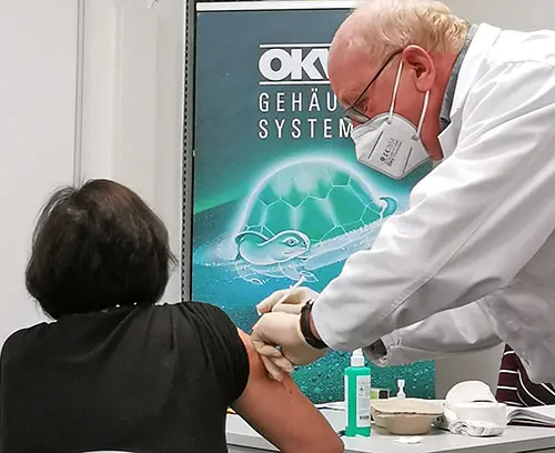 Gerade einmal 4 Monate ist die Zweit-Impfung gegen Corona durch den Betriebsarzt Dr. Michael Mikolaiczik bei OKW Gehäusesysteme her, da empfiehlt die STIKO nun Auffrischimpfungen auch für Personen ab 18 Jahren, bei denen der Antikörperwert sehr niedrig ist. Anlass für OKW in Zusammenarbeit mit dem Betriebsarzt Dr. Michael Mikolaiczik wieder tätig zu werden. Um das eigene Risiko besser abschätzen zu können, bot OKW allen Mitarbeitern/innen aus der Firmengruppe in Buchen und Schlierstadt die Möglichkeit eines Antikörpertests an.