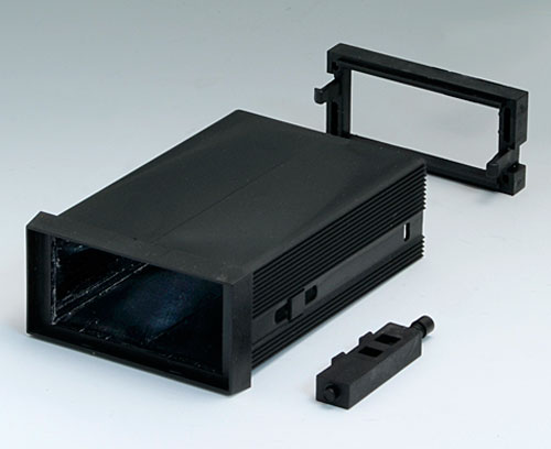 Gehäuse und Frontrahmen sind aus einem Stück. Der hintere Rahmen sowie die Front- und Rückplatten (Zubehör) werden einfach eingerastet. Mit Führungsstegen für den Leiterplatteneinschub an 2 Seiten. Entspricht DIN IEC 61554.