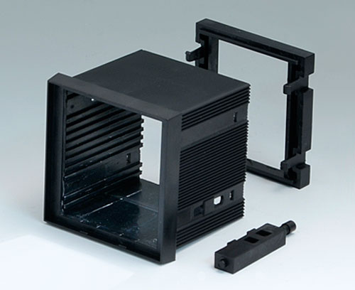 Gehäuse und Frontrahmen sind aus einem Stück. Der hintere Rahmen sowie die Front- und Rückplatten (Zubehör) werden einfach eingerastet. Mit Führungsstegen für den Leiterplatteneinschub an 2 Seiten. Entspricht DIN IEC 61554.