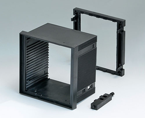 Gehäuse und Frontrahmen sind aus einem Stück. Der hintere Rahmen sowie die Front- und Rückplatten (Zubehör) werden gerastet. Entspricht nicht exakt der DIN IEC 61554.