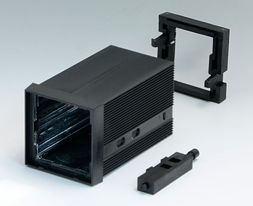 NORM-EINBAUGEHÄUSE TYP A Gehäuse und Frontrahmen sind aus einem Stück. Der hintere Rahmen sowie die Front- und Rückplatten (Zubehör) werden einfach eingerastet. Mit Führungsstegen für den Leiterplatteneinschub an 2 Seiten. Entspricht DIN IEC 61554.