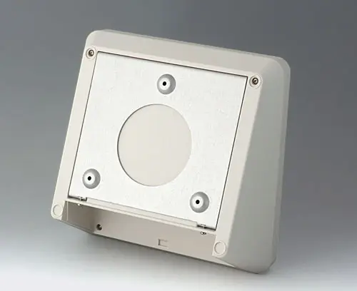 PROTEC 220, Ausf. III 3-teiliges Kunststoffgehäuse in modernem Design mit einer ergonomisch geneigten Bedienfläche. Der im Lieferumfang enthaltene Deckel ermöglicht zusätzliches Einbauvolumen in einem separaten Bereich. Befestigungsdome für Platinen und Bauteile im Ober- und Unterteil. Wandhalter und Dichtung (zur Erhöhung der Schutzart bis IP 65) im Zubehörprogramm. Unsichtbare Verschraubung mit Edelstahlschrauben und Torx-Antrieb. Durch das hochwertige Material  und die robuste Konstruktion auch im Außenbereich einsetzbar.