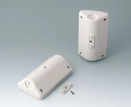 2-teiliges Kunststoffgehäuse mit konvex, gewölbtem Oberteil. Die dreieckige Grundform ermöglicht eine Verwendung in Ecken oder einen ergonomischen Aufstellwinkel von 45°. Robuste Konstruktion mit bewährter Nut- und Federverbindung. Verschraubung mit Edelstahlschrauben und Torx-Antrieb. Schutzart IP 40 ohne Dichtung. Befestigungsdome für Platinen und Bauteile in Ober- und Unterteil.