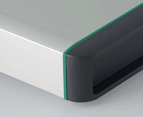 Robustes und elegantes Gehäuse mit zweigeteiltem Aluminiumprofil (glasperl-gestrahlt und eloxiert), Designdichtungen in Farbe grün und Abdeckkappen aus Kunststoff. Besonders gute Zugänglichkeit bei Montage- und Bestückungsarbeiten.