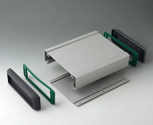Horizontale Leiterplatten-Führungen und Schraubkanäle im Gehäuse-Inneren. Plane Flächen für den einfachen Einbau der Schnittstellen. Vertieftes Bedienfeld zum Schutz von Displays, Folientastaturen und Bedienelementen. Seitliche Abdeckkappen mit zurückversetztem Areal zum Schutz der Kabel und Stecker.