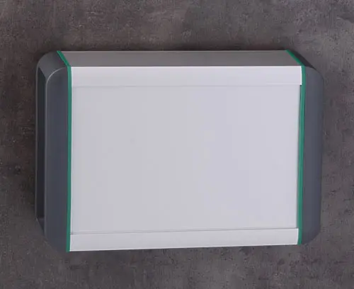 Robustes und elegantes Gehäuse mit zweigeteiltem Aluminiumprofil (glasperl-gestrahlt und eloxiert), Designdichtungen in Farbe grün und Abdeckkappen aus Kunststoff. Besonders gute Zugänglichkeit bei Montage- und Bestückungsarbeiten.