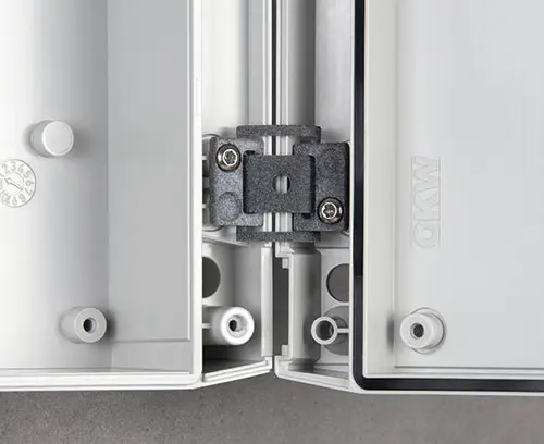 Additiv gefertigtes Scharnier zur Sicherung des Oberteils beim Öffnen des Gehäuses.