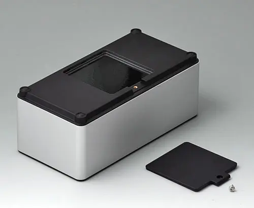 4-teiliges Gehäuse für vielfältige Einsatzbereiche. Stabiler Rahmen aus Aluminium, glasperl-gestrahlt und eloxiert. Kunststoffteile aus ASA+PC-FR mit hohem UV-Schutz und hohem Flammschutz. Befestigungsdome für Platinen und Bauteile im Ober- und Unterteil. Oberteil mit vertieft liegender Fläche zum Schutz der Folientastatur. Unterteil mit Öffnung und Deckel zum Verschrauben: Praktisch für den Einsatz eines Batteriefachs oder als Zugang zum Innenraum, z.B. für Memory Card oder Batterien, die direkt auf der Platine befestigt sind. Batteriefach-Set 4 x AA mit Kontaktfedern, Batterie-Clips, Knopfzellenhalter und Wandbefestigung als Zubehör.