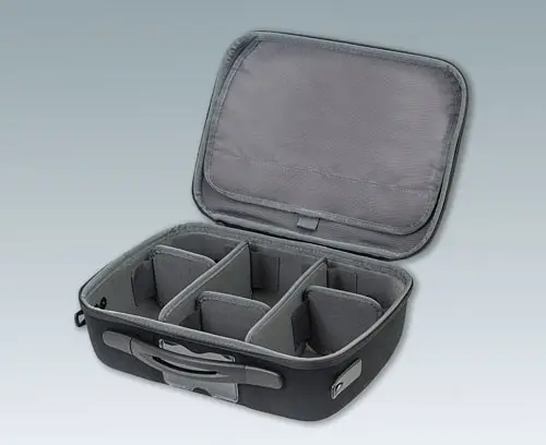 1 Koffer mit integrierten Fächern und Klettverschlussdeckel, 2 lange Trennwände (vertikale Anordnung) und 3 kurze Trennwände (horizontale Anordnung)