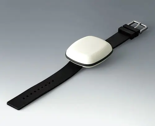 Socle de fixation pour circuit imprimé dans la partie supérieure ; après assemblage du boitier, le circuit imprimé tient tout seul entre les parties supérieure et inférieure. Alimentation interne par pile ronde ou pile bouton sur le circuit imprimé ou, en alternative, utilisation d’une pile rechargeable avec bobine permettant un chargement par induction de l’appareil.