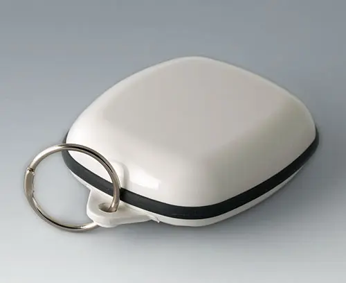 Boitier moderne pour les petits appareils du domaine des technologies portables. Conception en trois parties dont la partie supérieure et la partie inférieure en poli brillant et un joint en TPV mat.