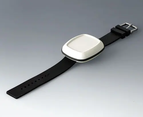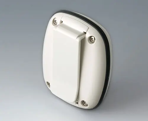 Boitier moderne pour les petits appareils du domaine des technologies portables. Conception en trois parties dont la partie supérieure et la partie inférieure en poli brillant et un joint en TPV mat. Surface en creux pour clavier à membrane ou feuille décorative.