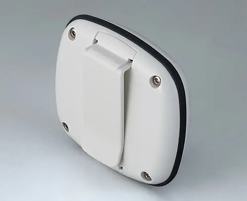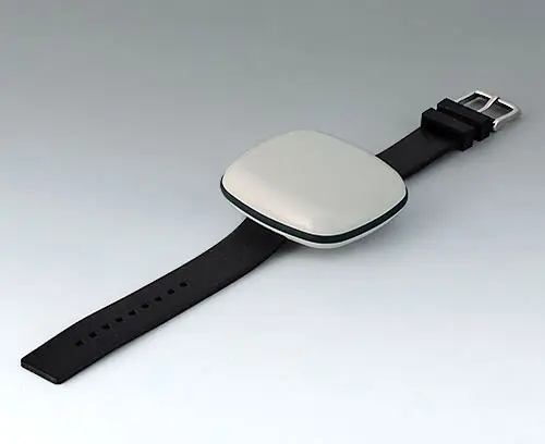 Boitier moderne pour les petits appareils du domaine des technologies portables. Conception en trois parties dont la partie supérieure et la partie inférieure en poli brillant et un joint en TPV mat.