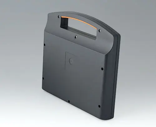 La partie supérieure comporte une zone en creux pour le clavier à membrane. Bossages de fixation pour les circuits imprimés et modules dans les parties supérieure et inférieure. Le montage des interfaces sur la face arrière du boitier, par ex. pour une utilisation sur bras de support, permet une pose correcte des câbles via raccordement au boitier.