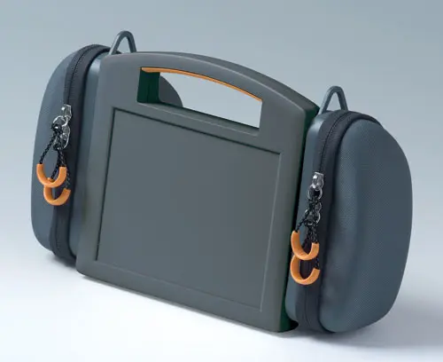 CARRYTEC M Boitier robuste avec poignée. Surface en creux pour les claviers à membrane. Les surfaces planes et antichocs de la partie inférieure du boitier se prêtent au montage d’interfaces, de connecteurs enfichables, de périphériques, etc. Le montage des interfaces sur la face arrière, par ex. pour une utilisation sur bras de support, permet une pose correcte des câbles via raccord au boitier. Bossages de fixation pour circuits imprimés et modules dans les parties supérieure et inférieure. Socle pour la transmission facile des données et du courant de chargement, et compartiment pour 5 piles AA (usinage sur demande) en accessoire.