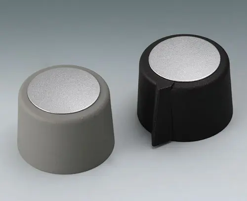 COM-KNOBS 23, avec un évidement Convenable pour des potentiomètres rotatifs avec des bouts d'arbre ronds selon DIN 41591. Système de noix de serrage pour l'assemblage des boutons convenable et frontale. Alésage sans chanfrein.
