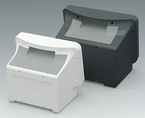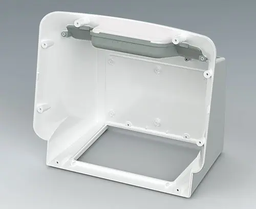 Face avant S À commander avec le corps du boitier COMMUNITEC S. Comprend une zone en retrait pour la protection des claviers à membrane et l'intégration d'écrans grand format jusqu'à 11,5" (29 cm), ainsi qu'une surface plane en partie basse pour les éléments de commande et les connecteurs. Des plots de fixation sont intégrés pour les PCB ou les platines de montage. Montage de la face avant par l’arrière.