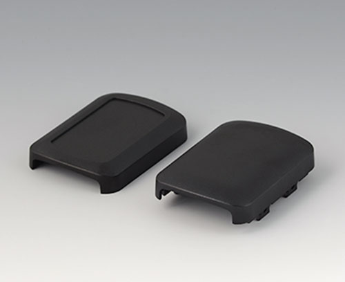 Boitier de base en deux parties, avec coquille de boitier convexe et aplanie. Zone en creux pour protéger le clavier à membrane la feuille décorative ou l’étiquette. Les deux extrémités ouvertes. Elles peuvent recevoir au choix des éléments d’extrémité ou des kits passe-câbles. (accessoires). Quatre bossages de fixation pour un circuit imprimé dans la coquille aplanie. Boitier en plastique entièrement emboîtable.