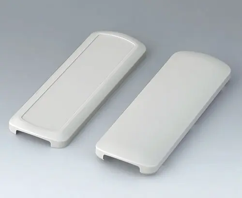Boitier de base en deux parties, avec coquille de boitier convexe et aplanie. Zone en creux pour protéger le clavier à membrane la feuille décorative ou l’étiquette. Les deux extrémités ouvertes. Elles peuvent recevoir au choix des éléments d’extrémité ou des kits passe-câbles. (accessoires). Quatre bossages de fixation pour un circuit imprimé dans la coquille aplanie. Boitier en plastique entièrement emboîtable.
