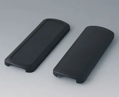 Boitier de base en deux parties, avec coquille de boitier convexe et aplanie. Zone en creux pour protéger le clavier à membrane la feuille décorative ou l’étiquette. Les deux extrémités ouvertes. Elles peuvent recevoir au choix des éléments d’extrémité ou des kits passe-câbles. (accessoires). Quatre bossages de fixation pour un circuit imprimé dans la coquille aplanie. Boitier en plastique entièrement emboîtable.