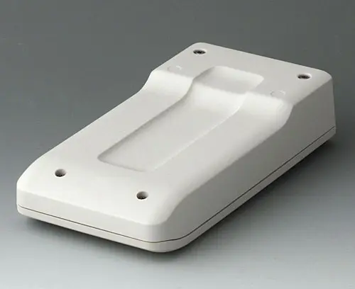Petit boitier manuel en deux parties, de conception robuste et ergonomique. Bonne tenue en main grâce au creux pour les doigts dans la partie inférieure. Zone de commande en creux pour la protection des éléments de commande. Bossages de fixation pour les circuits imprimés et les modules dans les parties supérieure et inférieure.