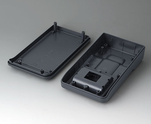 Petit boitier manuel en trois parties, de conception robuste et ergonomique. Idéal pour les applications électroniques miniaturisées. Bonne tenue en main grâce au creux pour les doigts dans la partie inférieure et un centre de gravité près du corps. Avec un compartiment pile accessible de l’extérieur pour 3 piles rondes NR6 1,5 V (AA). Zone de commande en creux pour la protection des éléments de commande. Bossages de fixation pour les circuits imprimés et les modules dans les parties supérieure et inférieure.