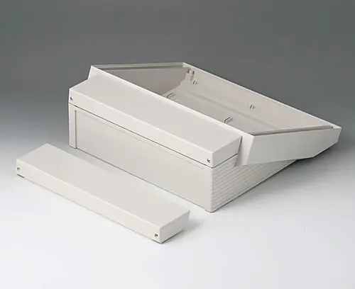 DATEC-TERMINAL L, Vers. III Boitier de base avec emplacement de bornes. La surface portant les éléments de commande à inclinaison ergonomique peut recevoir au choix une plaque profil, un couvercle ou une plaque frontale. Il convient au montage de cartes en format Europe.