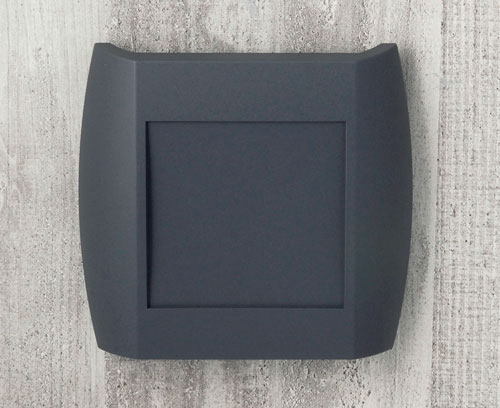Boitier en deux parties. La partie inférieure peut être installée directement au mur, la partie supérieure est alors vissée par le haut ou par le bas. Zone des éléments de commande en creux pour la protection du clavier à membrane. Bossages de fixation dans la partie inférieure et supérieure. Compartiment piles intégré pour deux piles AA.