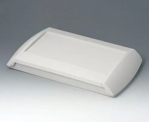 Boitier en quatre parties. La partie inférieure peut être installée directement au mur ; la partie supérieure se visse par le haut, et pour fermer le boitier, utiliser ensuite les deux obturateurs latéraux. Le cas échéant, les obturateurs encliquetés pourront être bloqués de manière à empêcher un accès non autorisé. Zone des éléments de commande en creux pour la protection du clavier à membrane. Bossages de fixation dans la partie inférieure et supérieure. Compartiment piles intégré pour deux piles AA / 1 x 9 V. Le cas échéant, le clapet S (couvercle à charnière) pourra être fixé au choix à droite ou à gauche pour recouvrir partiellement (d’un côté) la zone avec les éléments de dialogue.