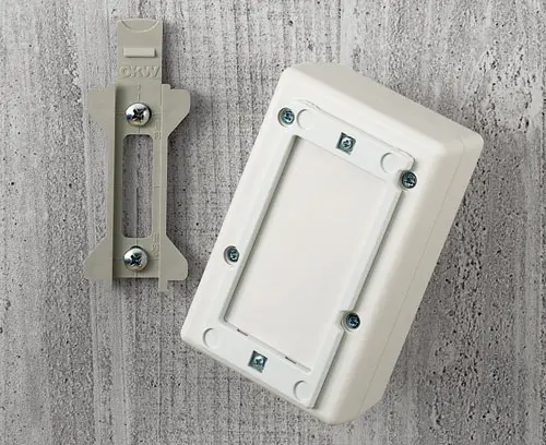 Construction en deux parties. Pour l'avoir, on visse l'adaptateur avec la partie inférieure. Des sacs préformés rendent possible d'encliqueter chaque boitier rapide et certain sur le support mural.