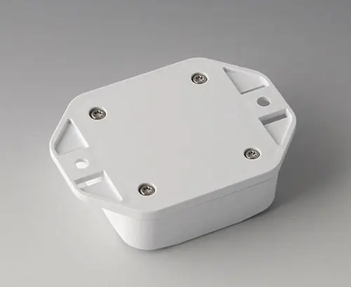 Boitier en plastique en 2 parties avec partie supérieure haute. Partie inférieure avec bride intégrée pour un montage mural rapide ou pour la fixation sur des rails et des profilés tubulaires ou sur un mât. Construction robuste avec assemblage éprouvé à rainure et languette. Vissage avec vis en acier inoxydable et entraînement Torx. Socle de fixation pour les circuits imprimés et les composants dans la partie supérieure et inférieure. La fixation sur les socles se fait par sertissage à chaud.