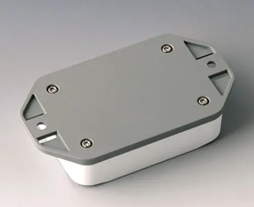 Boitier en plastique en 2 parties avec partie supérieure haute. Partie inférieure avec bride intégrée pour un montage mural rapide ou pour la fixation sur des rails et des profilés tubulaires ou sur un mât. Construction robuste avec assemblage éprouvé à rainure et languette. Vissage avec vis en acier inoxydable et entraînement Torx. Socle de fixation pour les circuits imprimés et les composants dans la partie supérieure et inférieure. La fixation sur les socles se fait par sertissage à chaud.