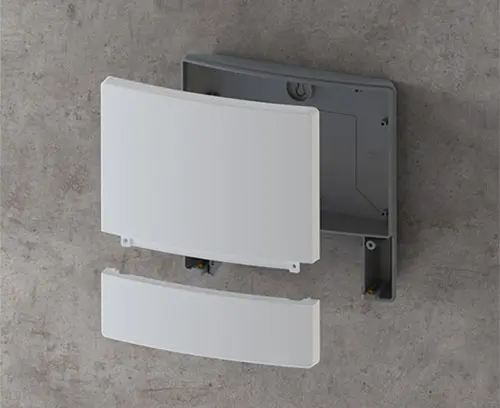 Boitier conçu en trois parties et néanmoins d’apparence uniforme grâce aux vis recouvertes. Combinaison de couleurs modernes en gris clairs et lava. 2 niveaux pour cartes à circuits imprimés, chacun avec quatre bossages de fixation dans la partie électronique. La grande qualité du matériau ASA+PC-FR permet également une utilisation sur le terrain.